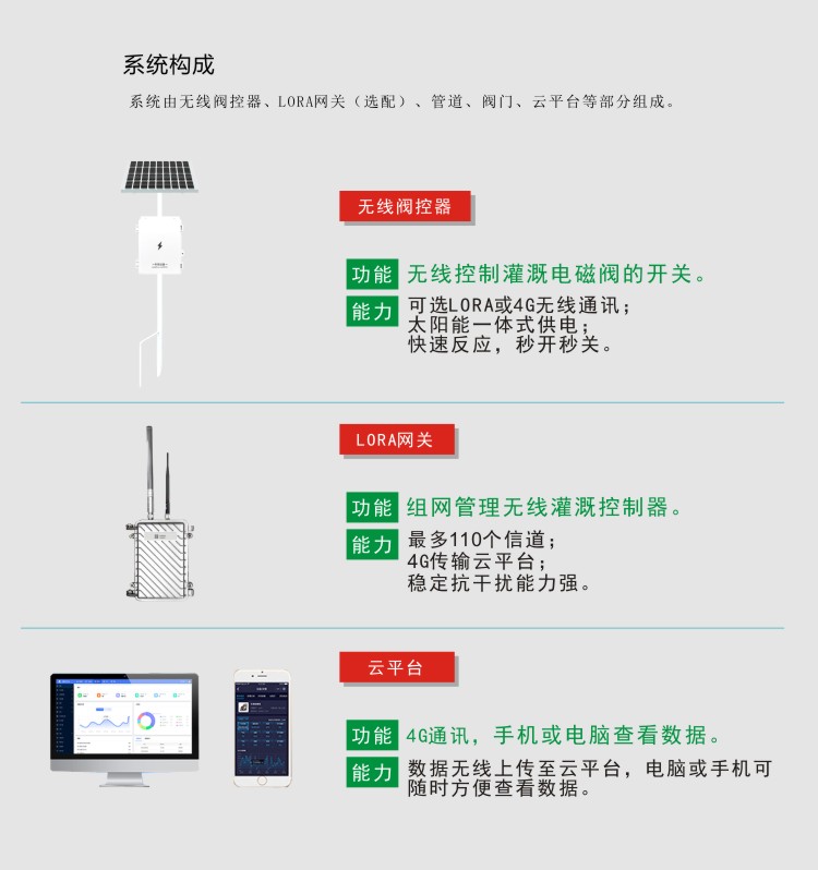 FY-WT800型無線閥控器專門用于自動灌溉控制,采用基于擴頻通信的超遠距離、可選用4G或低功耗LoRa無線傳輸技術,實現(xiàn)對灌溉設備的統(tǒng)一管理和遠程控制。具有節(jié)水,高效,節(jié)省人工的特點,精準調控,提高了水資源利用率,節(jié)水可達16%-30%。