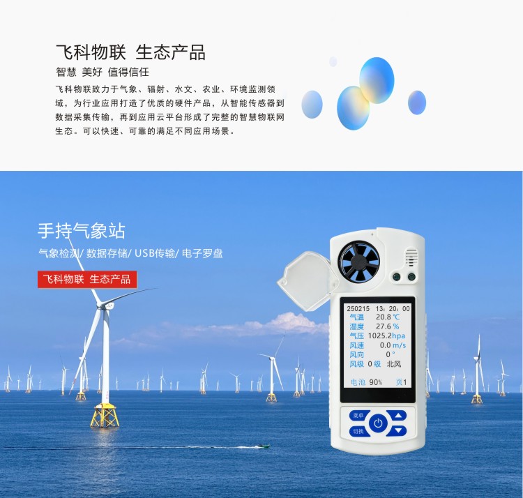 FY-Q9型可穿戴式手持氣象站是一款攜帶方便,操作簡單,集多項(xiàng)氣象要素于一體的可移動(dòng)式氣象觀測儀器。系統(tǒng)采用精密傳感器及智能芯片,用于測量風(fēng)速、風(fēng)向、溫度、濕度、露點(diǎn)、大氣壓力、BF 薄福、風(fēng)寒指數(shù)、海拔高度、光照、紫外等數(shù)據(jù),并可擴(kuò)展GPS定位功能。內(nèi)置大容量FLASH存儲(chǔ)芯片可存儲(chǔ)至少一年的氣象數(shù)據(jù);通用USB通訊接口,使用配套的USB線纜即可將數(shù)據(jù)下載到電腦,也可選配4G版本,可無線傳輸至云平臺(tái)。本儀器可用于農(nóng)林、環(huán)保、海洋、科學(xué)考察等領(lǐng)域。